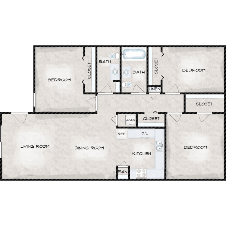 La Vista Apartments offers 3 wonderfully designed floor plans tailored to your needs. Our 1, 2 and 3 bedroom apartment homes were designed with style and comfort. Each home is detailed with a long list of amenities, including but not limited to microwave, pantry, tile floors and ceiling fans.